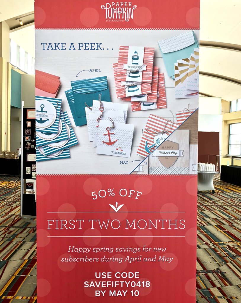 And last but certainly not least, I want to share with you the awesome Paper Pumpkin Sale that we have going on. If you haven’t tried Paper Pumpkin, now is the time to try. Not only are you getting to see a sneak peek of what next month’s Paper Pumpkin will be but you are also going to get the first TWO months at 50% off. Today is the deadline to sign up for April’s Nautical Paper Pumpkin. But, there is also a little sneak peak of May’s kit as well. To order Click Here and then Click the Paper Pumpkin Link at the top of the page. This will take you to the page to sign up. Don’t forget the enter the CODE SAVEFIFTY0418 This will give you 50% off 2 Months subscription. That is $9.98 per month. AND that includes shipping.