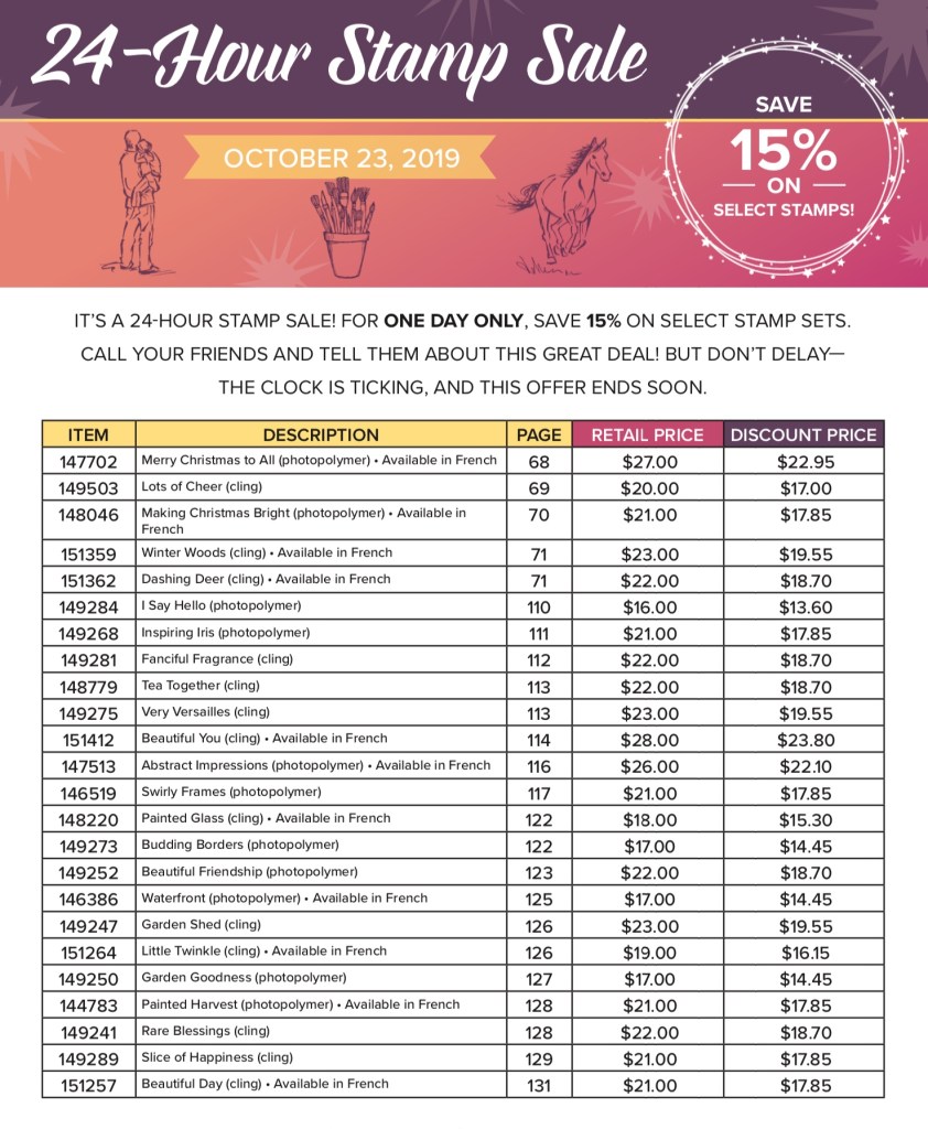 Stampin’ Up! is having a 24 hour sale on Wednesday October 23, 2019!